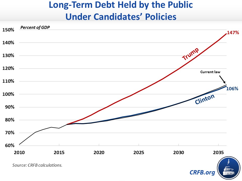 Extrapolating our previous ten-year estimates, we project that debt held by the public would reach approximately 106 percent of GDP under Clinton by 2036 and would rise rapidly to 147 percent of GDP under Trump by 2036.